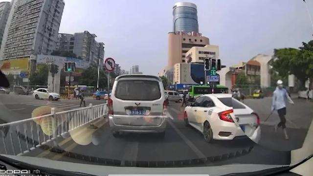 网传的这段视频画面来自于行车记录仪。视频显示,8月1日下午4点多,4个戴着白帽子和口罩的年轻人,骑着两辆电动车在路口停下,紧接着,坐在后座的两人手持砍刀从车上下来,边走边叫嚣。可没过几秒钟,这几人又跳上电动车狼狈逃窜。这时,另外两名男子跑入画面中,像是在追赶四名持刀人。