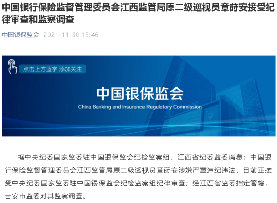 根据银保监会官微11月30日发布的公告,原江西银保监局二级巡视员章莳安涉嫌严重违纪违法,目前正接受中央纪委国家监委驻银保监会纪检监察组纪律审查;经江西省监委指定管辖,吉安市监委对其监察调查。