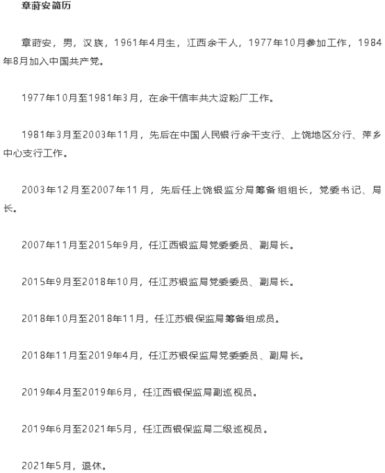 2018年10月,随着原银监、保监系统的合并,章莳安任江苏银保监局筹备组成员,后任江苏银保监局副局长。在退休前的最后两年,作为江西余干人的章莳安“落叶归根”,2019年4月任江西银保监局副巡视员,同年6月至今年5月退休前任江西银保监局二级巡视员。