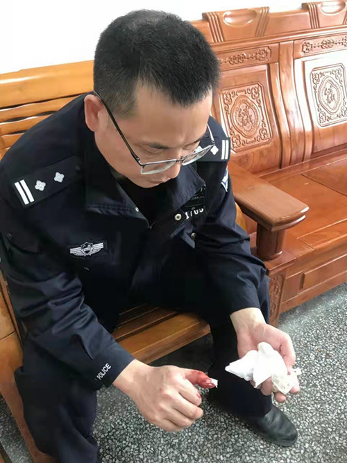 为确保不发生意外,民警一边与女子沟通劝解分散其注意力,一边紧盯着其手中的利器,找时机夺走。就在女子持利器的手不经意下落的一瞬间,民警瞅准时机,果断上前紧紧握住其双手,将利器夺下。在争夺过程中,民警的手还不慎被划伤。