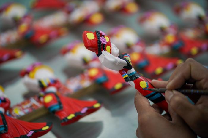 云南省文山壮族苗族自治州西畴县瓦厂村村民制作的彩绘文创产品(3月27日摄)。近年来,乡村小作坊逐步发展成拥有民俗文化、卡通创意等七大系列、一百多款产品的特色文化创意工场,产品远销省内外。