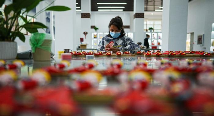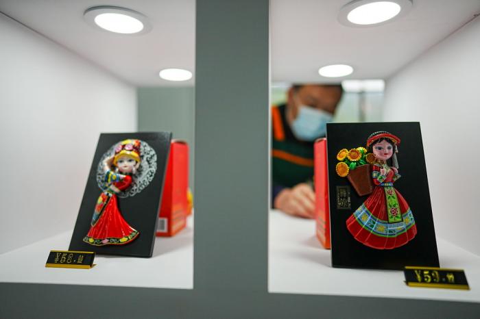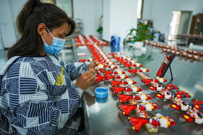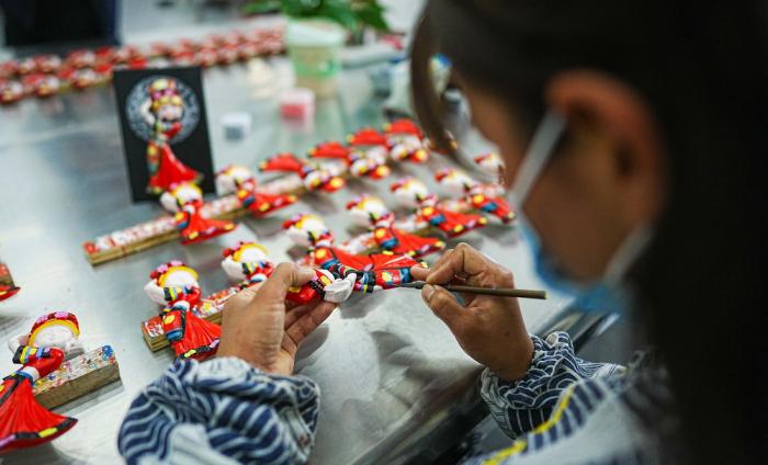 云南省文山壮族苗族自治州西畴县瓦厂村村民在制作彩绘文创产品(3月27日摄)。2021年底,当地还建成了集游客接待、产品展示、生产作业、互动体验等多种功能于一体的西畴汤谷文化创意产业园,助力村民在家门口就业增收。