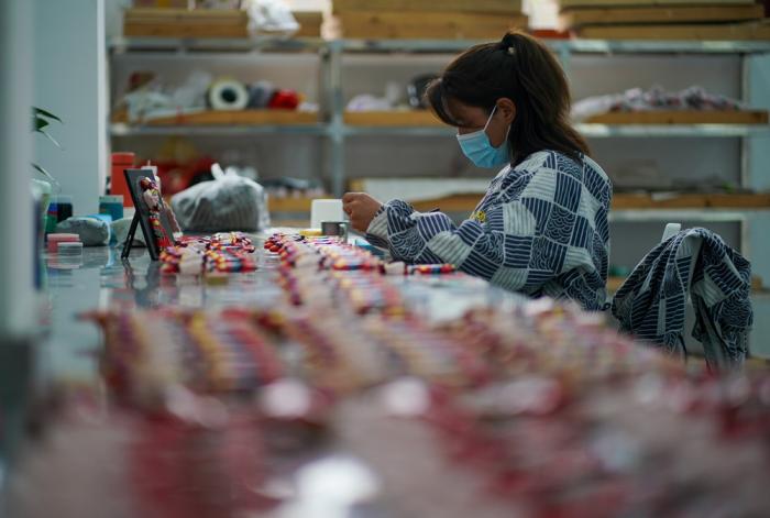云南省文山壮族苗族自治州西畴县瓦厂村村民在制作彩绘文创产品(3月27日摄)。