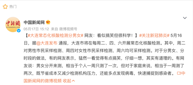 而辽宁省大连市常态化核酸检测分男女——要求每周二、周四、周六进行常态化核酸检测,周二男性测,周四女性测,周六均可测。