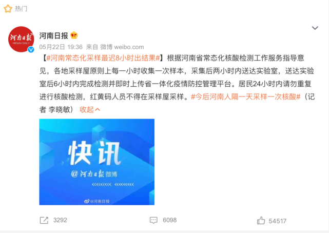 5月21日,河南省疫情防控指挥部下发最新通知,明确河南省常态化核酸检测工作服务指导意见,要求全省居民及其他在豫人员原则上每48小时应完成至少一次核酸采样(间隔一天采样一次)。
