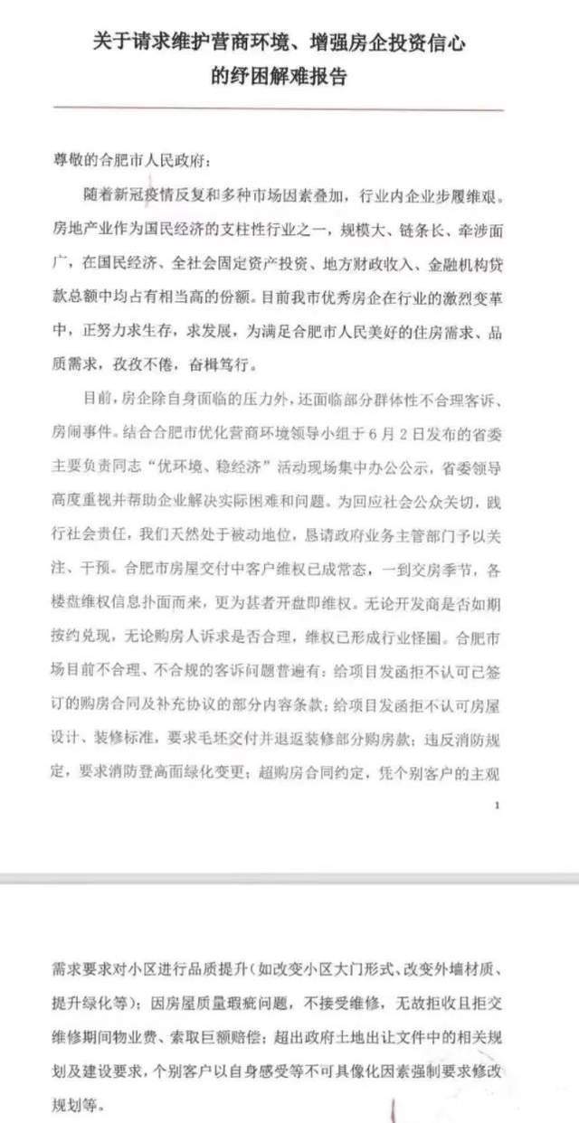 文件称,合肥市房屋交付中,普遍有不合理、不合规的客户诉求问题,因房屋质量瑕疵问题,不接受维修,无故拒收且拒交维修期间的物业费,索取巨额赔偿。客户诉求高度一致,背后可能有专业房闹机构推波助澜,并形成产业化趋势。因此,恳请合肥市政府坚决遏制专业房闹及“恶意维权”行为。