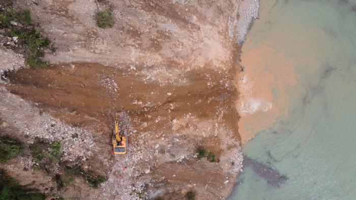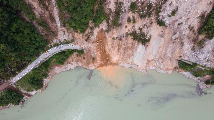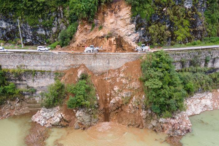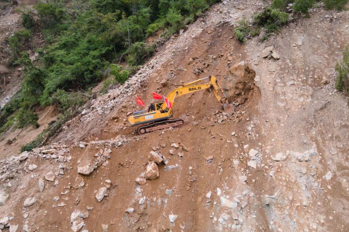9月8日,四川路桥的工作人员抢修石棉县与泸定县得妥镇之间的道路(无人机照片)。 四川甘孜州泸定县6.8级地震发生后,与泸定县毗邻的雅安市石棉县境内多处道路受损严重。