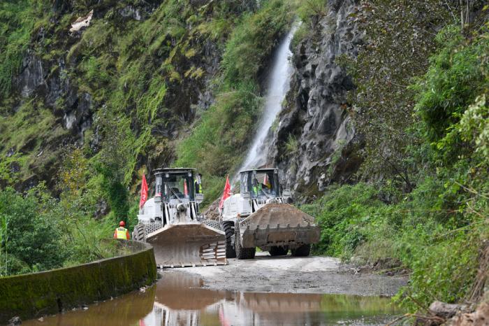9月8日,四川路桥的工作人员抢修石棉县与泸定县得妥镇之间的道路(无人机照片)。