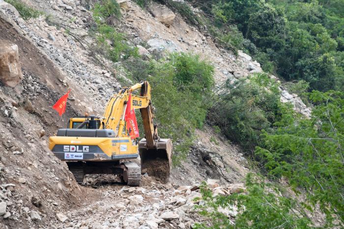 9月8日,四川路桥的工作人员抢修石棉县与泸定县得妥镇之间的道路。