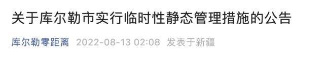 8月13日,《关于库尔勒市实行临时性静态管理措施的公告》发布。