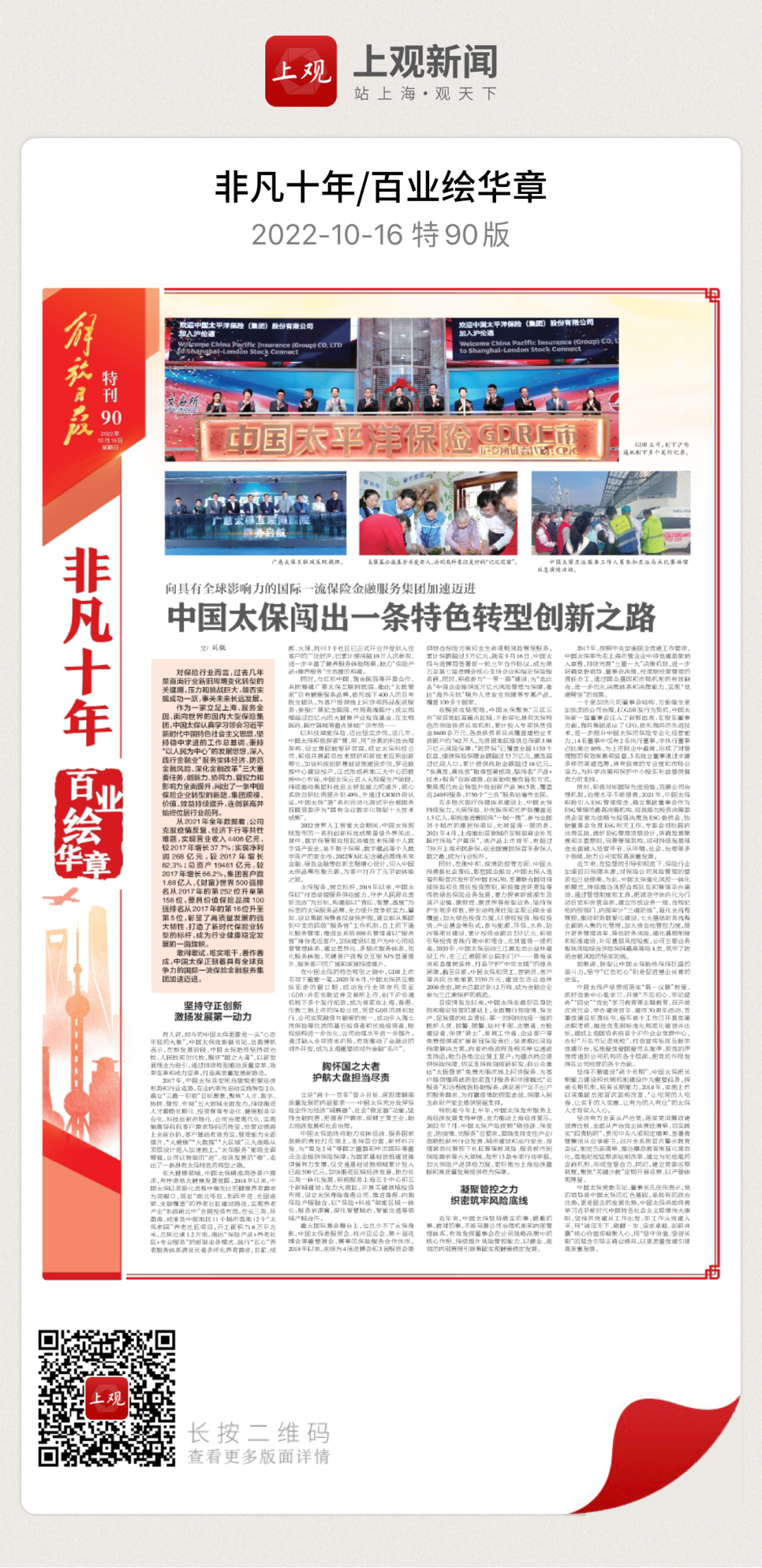10月16日,《解放日报》刊发喜迎二十大“非凡十年”特刊,其中整版刊发深度报道《中国太保闯出一条特色转型创新之路》,以下为全文转载。