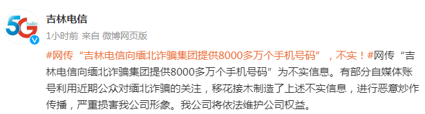 网传“吉林电信向缅北诈骗集团提供8000多万个手机号码”,吉林电信:不实