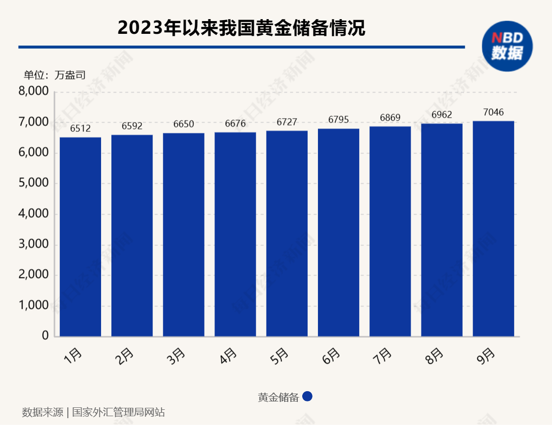 数据显示,中国人民银行已连续11个月增加黄金储备。10月7日,国家外汇管理局公布数据显示,截至9月末,官方储备资产中,黄金储备达7046万盎司(约2191.55吨),较上月环比上升84万盎司(约26.12吨),黄金储备已连续11个月增加,占我国官方储备资产总额的比例为4%。这是我国央行黄金储备首次站上7000万盎司大关。