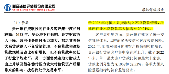 联合资信在对贵州银行的最新信用评级报告中也表示,2022年贵州银行政信类贷款占比较高,考虑到降杠杆以及消除地方政府隐性债务不断推进对贵州省相关企业短期流动性形成的压力,未来需持续关注相关产业内企业短期流动性压力以及长期贵州省内经济发展波动对贵州银行资产质量带来的影响。