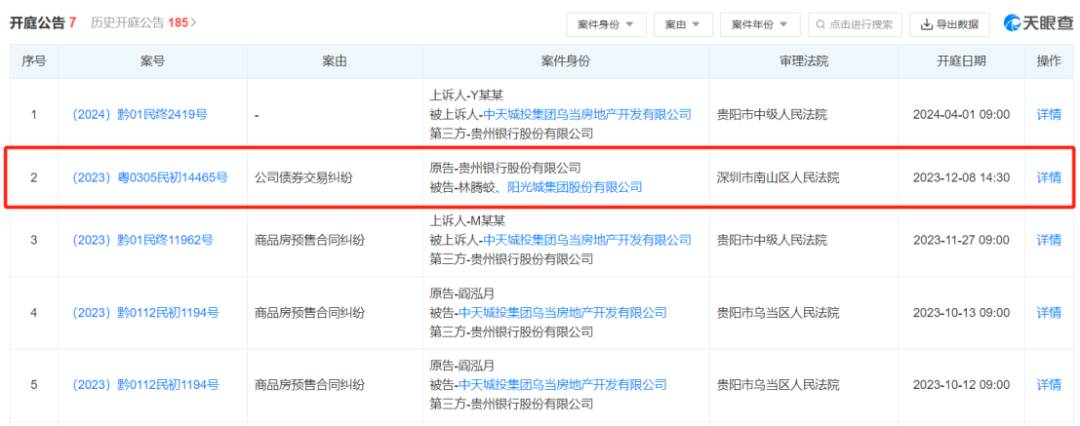 此外,贵州银行踩雷的房企不止一家。2023年以来,贵州银行新增多起“涉房”类诉讼,案由包括公司债券交易纠纷、商品房预售合同纠纷等。在2023年12月,贵州银行因公司债券交易纠纷站上原告席,起诉阳光城集团股份有限公司及其原董事长林腾蛟。