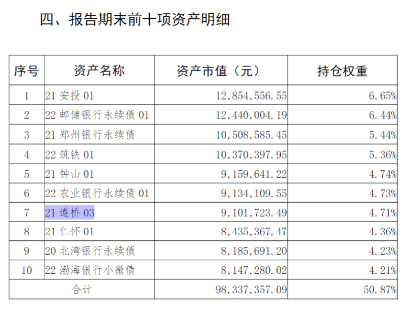 另外,在理财产品“贵银恒利黔利盈定开第42期”的前十项资产中,出现了债券“21遵桥03”,其发行方为遵义道桥建设(集团)有限公司,是遵义市最大城投发债主体,此前其发布的规模为155.94亿元银行贷款重组方案备受业界关注。