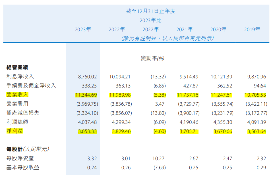 根据贵州银行2023年年报,去年贵州银行营业收入为113.45亿元,降幅5.38%;净利润为36.53亿元,降幅4.60%。这是自贵州银行2019年上市以来的首次营收、净利双降。