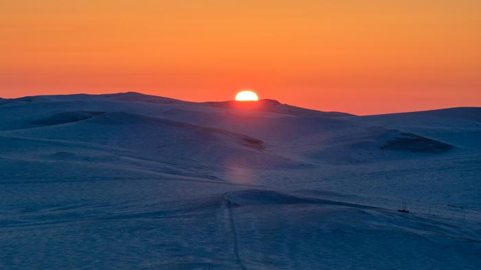 这是12月3日在内蒙古呼伦贝尔市陈巴尔虎旗拍摄的呼伦贝尔大草原日出风光(无人机照片)。新华社记者 达日罕 摄