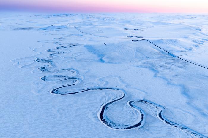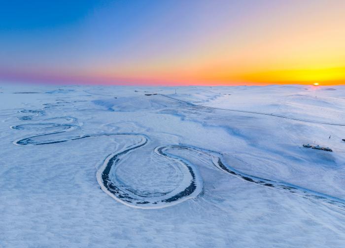 冬日里,呼伦贝尔大草原银装素裹。在内蒙古自治区呼伦贝尔市陈巴尔虎旗境内,莫尔格勒河蜿蜒曲折穿过雪原,蒙古包点缀其间,构成一幅宁静壮美的北国冬日画卷。