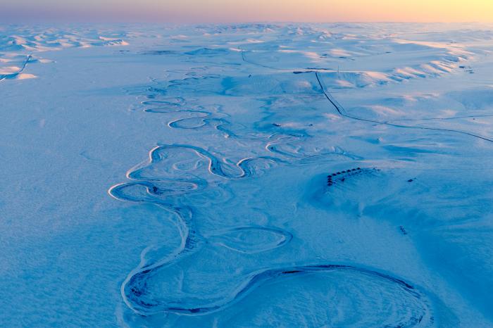 这是12月3日在内蒙古呼伦贝尔市陈巴尔虎旗拍摄的流经雪原的莫尔格勒河(无人机照片)。新华社记者 达日罕 摄