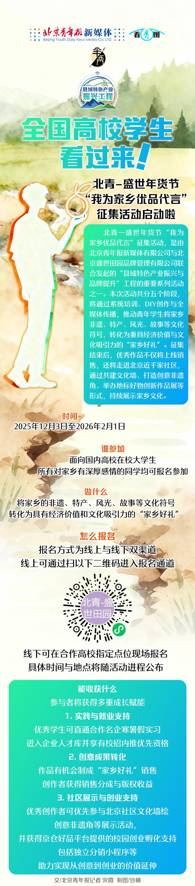 全国高校学生看过来!北青—盛世年货节“我为家乡优品代言”征集活动,是由北京青年报新媒体有限公司与北京盛世田园品牌管理有限公司联合发起的“县域特色产业振兴与品牌提升”工程的重要系列活动之一。本次活动共分五个阶段,将通过系统培训、DIY创作与全媒体传播,推动青年学生将家乡非遗、特产、风光、故事等文化符号,转化为兼具经济价值与文化吸引力的“家乡好礼”。征集结束后,优秀作品不仅将上线销售,还将走进北京近千家社区,通过共建文化墙、打造创意非遗角、举办地标好物创新作品展等形式,持续展示家乡文化。