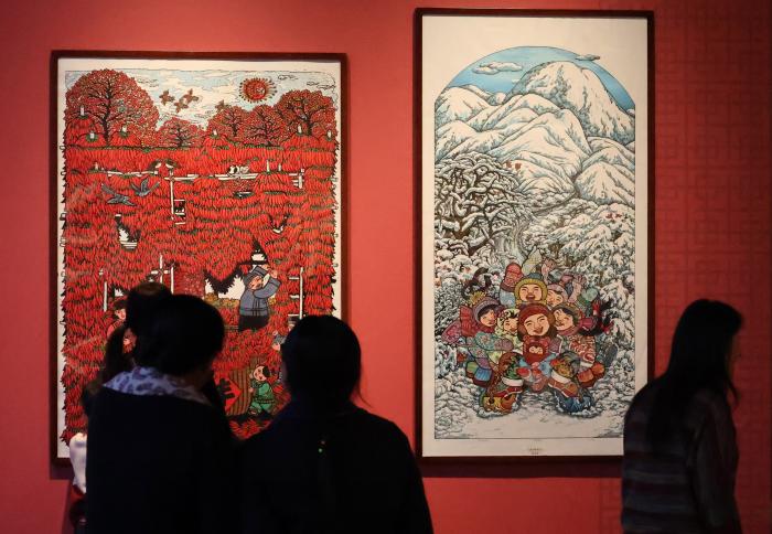 此次展览的展品以辽宁省博物馆20世纪50年代征集的桃花坞年画、杨柳青年画为主,还包括入选辽宁省级非物质文化遗产代表性项目名录的桓仁传统木版年画等。1月16日,观众在辽宁省博物馆观看展出的年画作品。