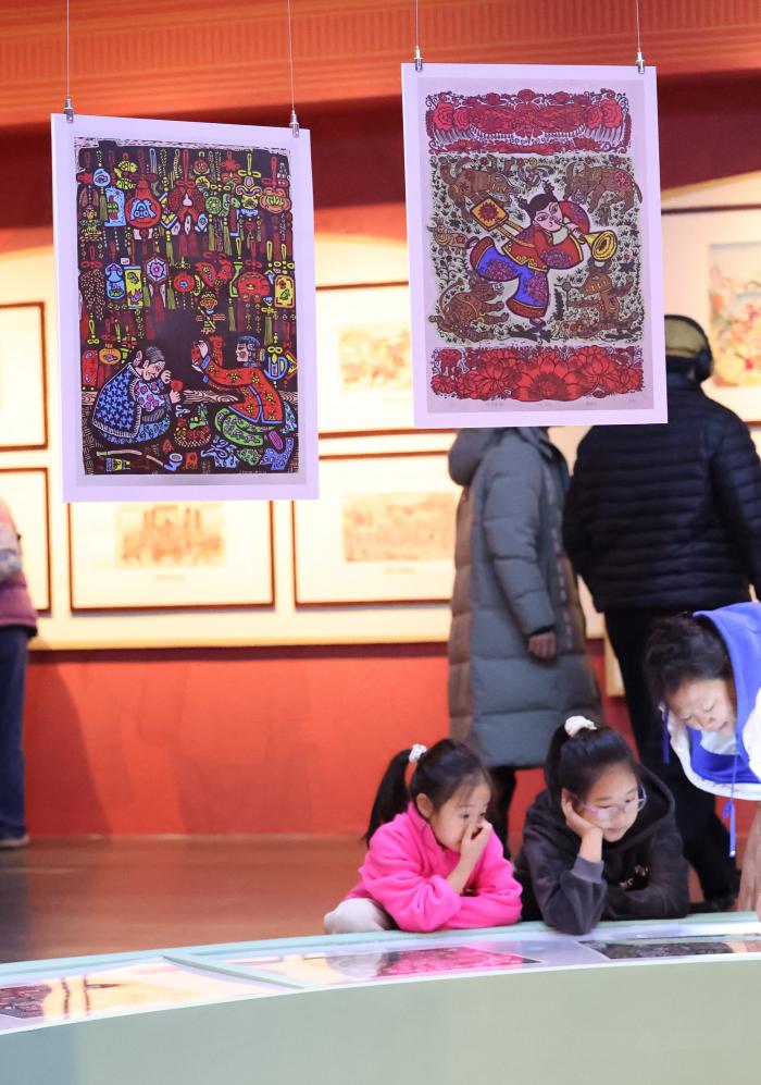 1月16日,一名小女孩在辽宁省博物馆观看展出的年画作品。