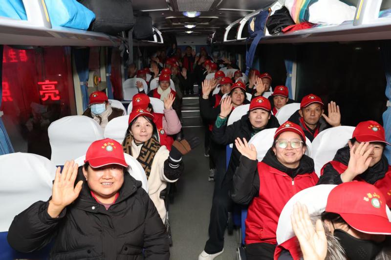 在两地人社部门的全程护航下,今年首批进京的“吕梁山护工”乘坐的大巴,在夜幕中缓缓驶入北京市房山区吕梁山护工集散地,简单休整后迅速上岗,定向匹配到家政服务一线岗位。在这场跨越近700公里的“温暖接力”中,京晋两地人社部门提供了“出家门、上车门、进厂门”的全链条保障服务。两地人社专员全程跟车,并贴心准备了面包、牛奶、热水等物资。大巴抵达后,等候多时的工作人员送上暖心问候并引导护工们前往住所。欢迎仪式上,护工们收到了工作人员送来的爱心慰问包,围坐一桌吃上了团圆饭。