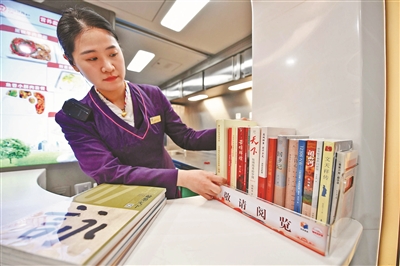 一走进“书香列车”,就能感受到浓浓的阅读氛围:车厢两端悬挂“共促全民阅读·共建书香社会”主题海报;座椅头枕巾上印有“书香铁路”电子阅读二维码,旅客扫码就能免费阅读海量电子书;列车5号、11号车厢的餐吧台专门设置了“读书角”,摆放着铁路科普、人物传记、经典文学等各类精选图书,旅客可以免费借阅。此外,乘务组还推出了“流动书车”服务,定时把图书送到每一节车厢。