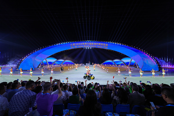 当晚的开幕式现场亮点纷呈,赛事吉祥物“亚亚”骑着沙滩摩托车引领各国家和地区代表团入场,成为全场焦点。开幕式依托滨海自然景观搭建沉浸式舞台,融合椰风海韵、黎锦苗绣等海南本土文化元素,通过“人机协同空中特技”、百米地面投影与环形光屏联动,动态模拟天色变幻,生动诠释自贸港建设者的拼搏精神。