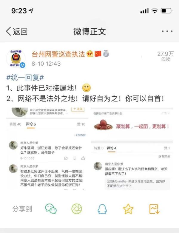 据江苏省南京市公安局秦淮分局官方微博8月11日消息,8月10日,公安机关发现有网民在微博发布多条不当言论,对因台风受灾的浙江相关城市和市民进行谩骂和侮辱,在网络造成恶劣影响。南京秦淮警方将发布言论的王某(男,37岁,南京市秦淮区人)查获。