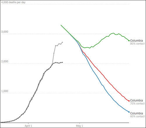 哥伦比亚大学3种预测,绿线为80%接触,红线为70%接触,蓝线为60%接触 《纽约时报》报道截图