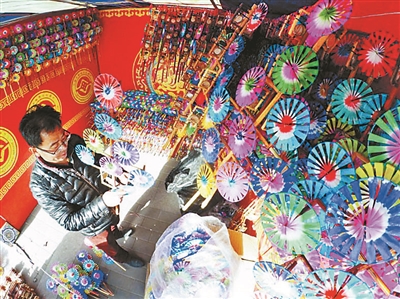 | 龙潭庙会的一位商户在摊位布展传统风车 |