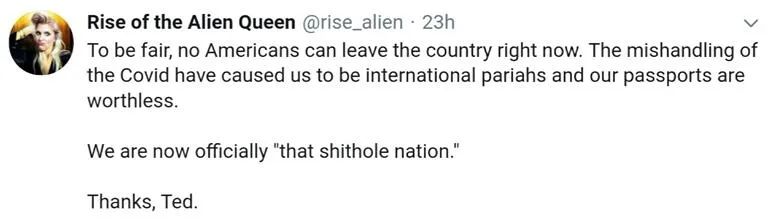 “客观地说,现在没有美国人能出国,因为美国政府的防疫失职已经令美国成了一个垃圾国家,我们的护照都没价值了。”