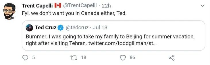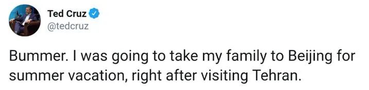 先说科鲁兹吧。在中国官方宣布制裁他后,他在自己的社交账号上写下了这么一段似乎是在“调侃”中国的话语:“好遗憾啊,我本来还想在去过德黑兰后,带着家人去北京过暑假的。”