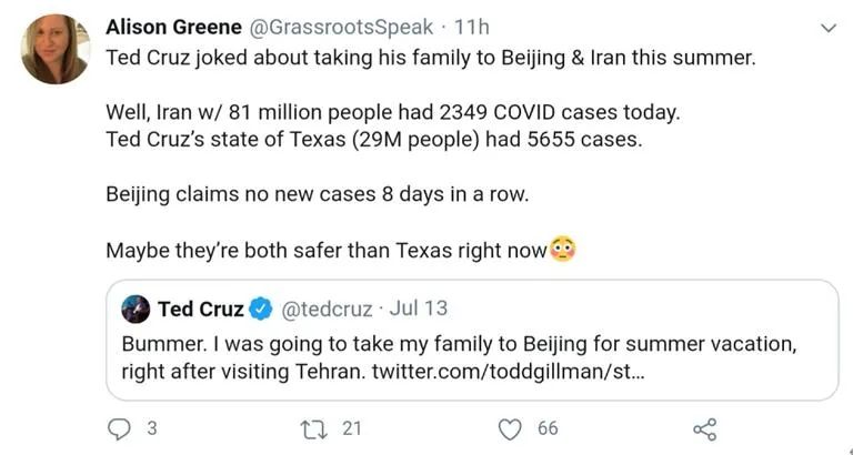 然而,这名来自美国得克萨斯州这个全美新冠疫情最严重地区之一的政客,他获得的美国网民的跟帖却大多是下面这种“画风”的:“得州今天增加了5655个新病例,而北京8天都没有新病例了……”