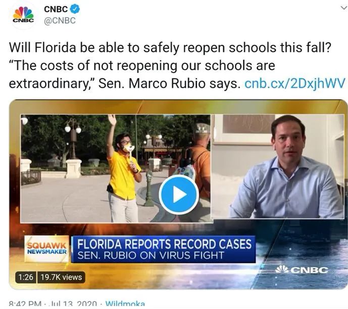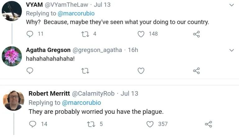 但由于卢比奥也来自美国新冠疫情非常恶劣的佛罗里达州,而且他最近还在变相支持美国总统特朗普不顾疫情恶化强推学校复课的做法,所以他得到的留言也几乎都是在对他——而不是中国——表达不满的。