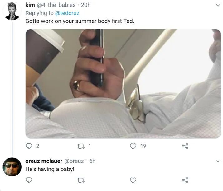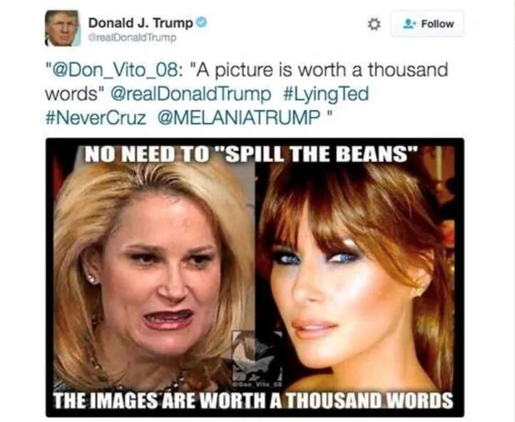 另外,一些反感科鲁兹的美国网民还因为他在发帖时提到了他的家人,而用另一件旧事讽刺起了他:4年前,当时还在竞选美国总统的特朗普,曾发布过一张攻击科鲁兹妻子的图片,称他的妻子长得丑,没自己的妻子好看。可在特朗普成为总统后,科鲁兹却立刻成为了这名羞辱过自己妻子的男人的支持者。