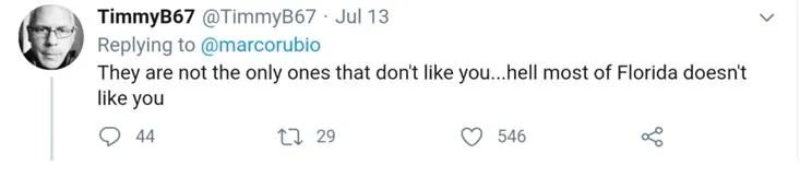 如下图所示,给卢比奥留言的美国网民中,有人就表示:不止中国人不喜欢你,许多佛罗里达人也不喜欢你。