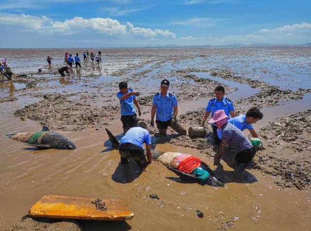 据了解,5日下午,这支领航鲸队伍就已经出现在临海市头门港。它们在领队的带领下畅游在附近海域,还有网友拍下它们顽皮的游泳姿势。临海市公安局宣教科副科长杨威涛告诉北青-北京头条记者,6日早8时3分,警方接到的报警后便立即出警赶赴现场。到达现场后发现,12头领航鲸搁浅在临海市头门港码头附近的滩涂上。由于海水退潮,搁浅的领航鲸脱水严重。现场拍摄的视频显示,有领航鲸被困滩涂淤泥中,不断摆动尾鳍仍难以挣脱。