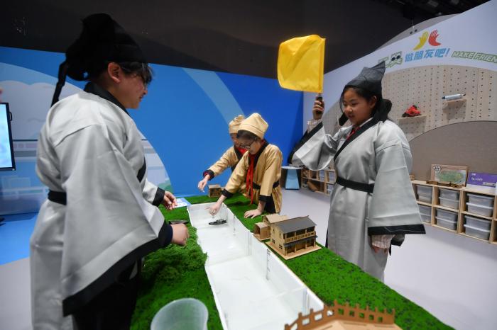 学生在展厅中进行互动体验。