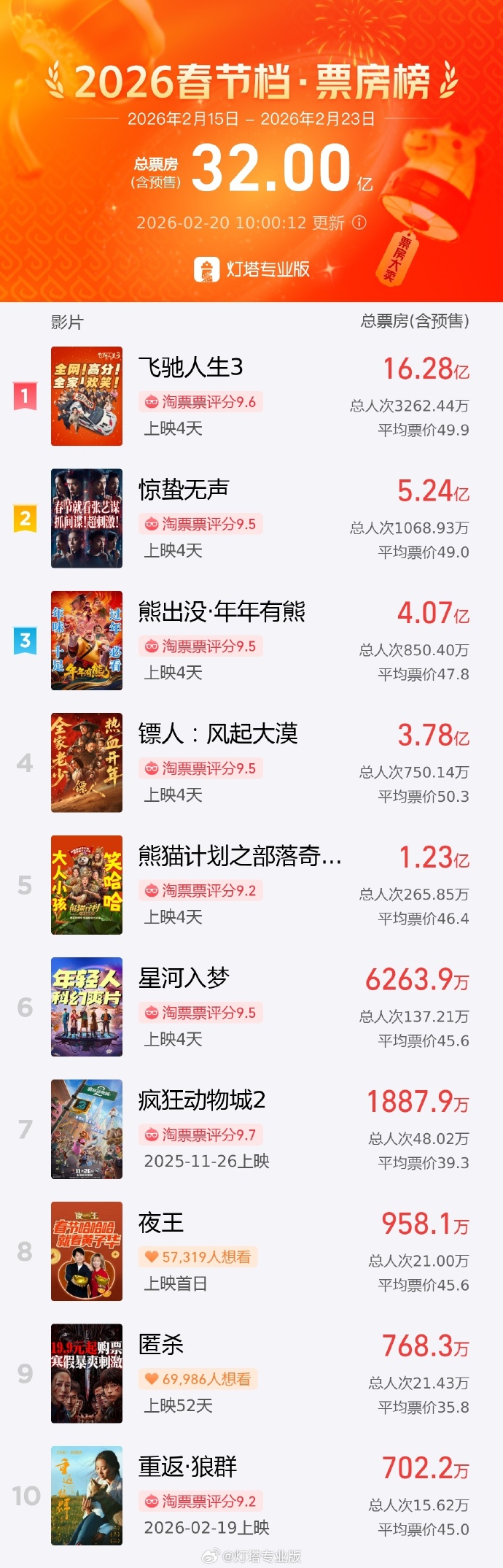 据灯塔专业版,截至2月20日10时,2026春节档(2月15日-2月23日)档期总票房(含预售)突破32亿。