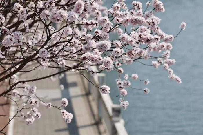 漫步在步道上,粉白色的花朵缀满枝头,与清澈的河水相映成趣,微风拂过,花瓣轻摇,引得不少市民驻足拍照。
