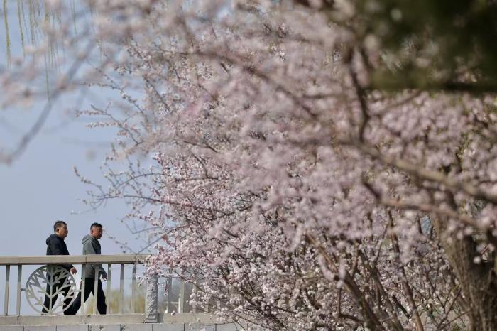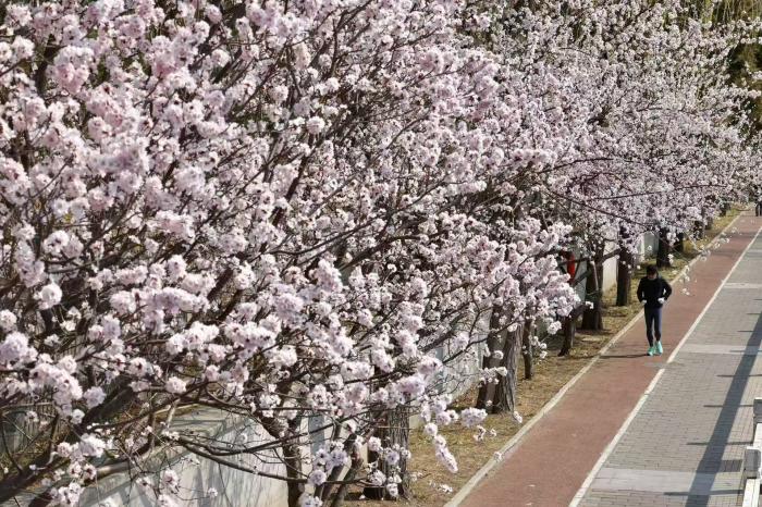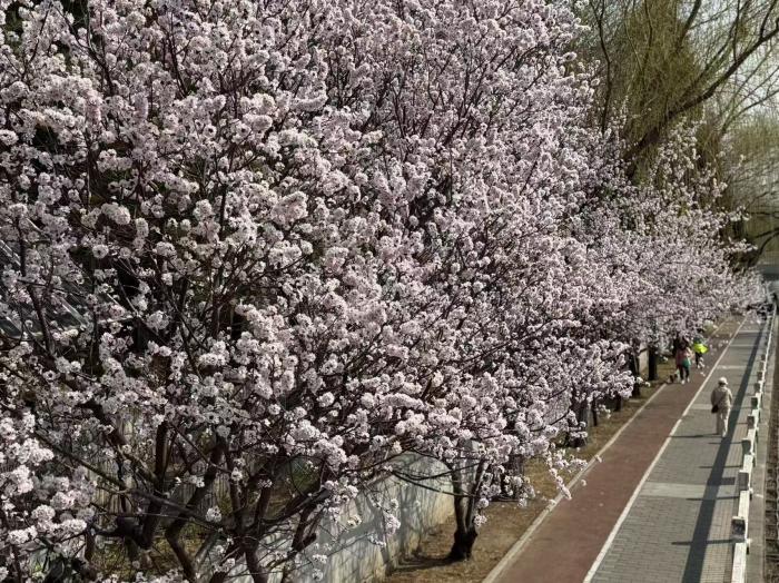 3月16日,天坛公园南门南侧的南护城河北岸步道旁,粉白春花竞相绽放,绵延成一片浪漫花海,成为市民春日踏青的热门打卡点。