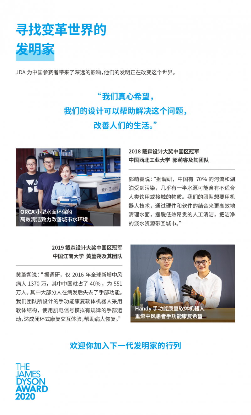 自2005年创办以来,戴森设计大奖(James Dyson Award)每年都向全球富有创新和创业精神的工程及设计专业在校生和新近毕业生发起挑战,邀请他们设计一个解决实际问题的方案。今年除国际冠军外,戴森设计大奖首次增设可持续发展奖。