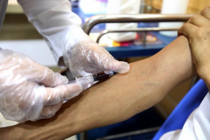 8月27日,一名医务工作者在伊拉克巴格达的一家医疗中心从患者身上采集血液样本。