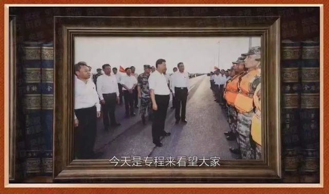 场景:在巢湖大堤上,习近平亲切看望慰问了在防汛抗洪救灾斗争中牺牲同志的家属、防汛抗洪一线人员、先进典型代表和参加抗洪抢险的部队官兵,并向全国奋战在防汛抗洪救灾一线的同志们表示诚挚的问候。