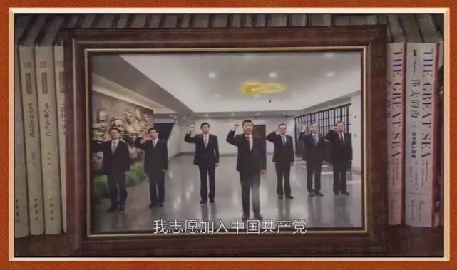 场景:这张照片从2018年新年贺词开始,一直出现在习近平的书架上。习近平带领其他中共中央政治局常委同志一起回顾建党历史,重温入党誓词,宣示新一届党中央领导集体的坚定政治信念。