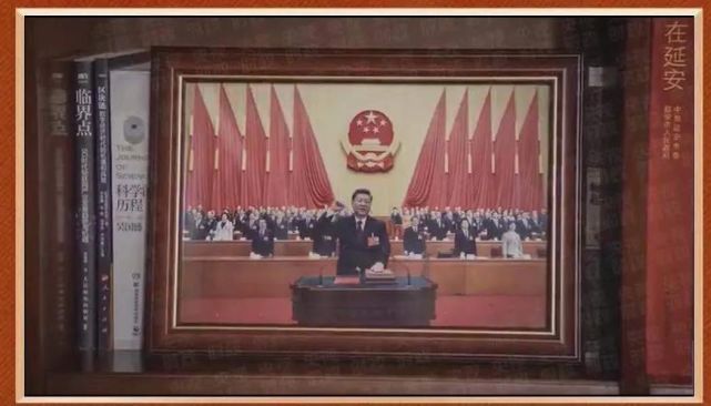 场景:这张照片从2019年新年贺词开始,一直出现在习近平的书架上。在十三届全国人大一次会议上,习近平主席面对近3000名全国人大代表,面对十三亿多人民,庄严进行宪法宣誓。这是新中国成立以来,我国最高领导人首次进行宪法宣誓。