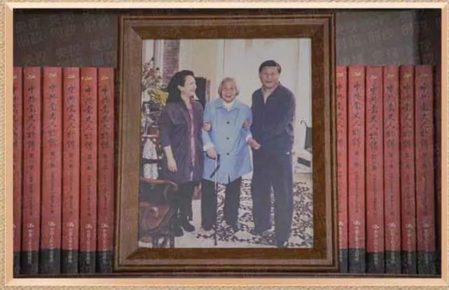 这张照片今年第一次出现在习近平的书架上。照片中,习近平和夫人彭丽媛搀扶着母亲齐心。